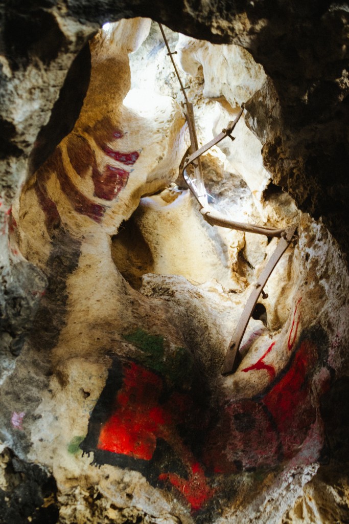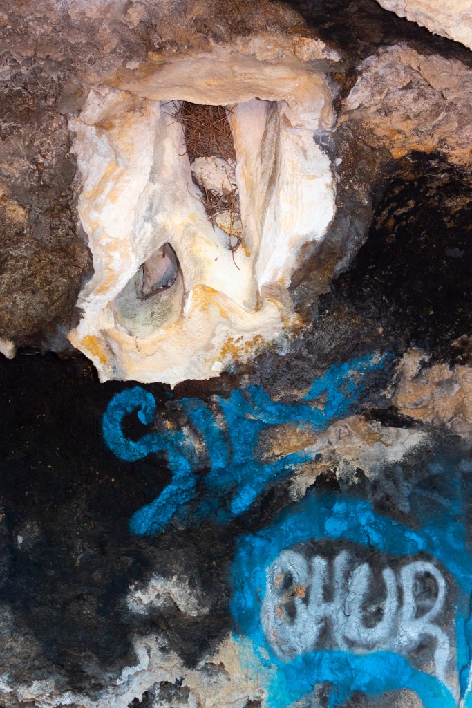 What became apparent as I explored this cave, was that I was not alone. No, I didn’t encounter any other humans, nor vengeful spirits, but there were bees and birds creating their homes in and around this cave. All life forms seemed to be in agreement, this cave is an excellent location to plant their roots. But once the bees and birds depart there will be naught but a nest or a hive that remains, and these will soon be dissolved back into nature. Where as humans plant their roots through plastic and paint and other toxic chemicals that will continue to exist far beyond their usefulness, if they were ever useful to begin with. The remains of animal habitation can be beautiful in their own way, but the signs of human habitation are ugly, toxic, unnatural. And yet it is our nature to create these things.
