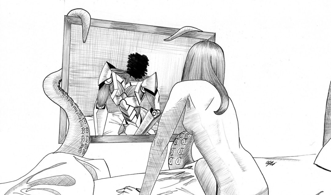 I’ve never drawn erotic art before, so off I went to Porn Hub for anatomy reference. What I saw was quite miserable, it’s all so cold, and mechanical, and vulgar. To remedy this, I combined that with my knowledge of Romantic art and Greek sculptures to bring in the warmth, and gentleness, and humanity. Sex should be a wonderful, loving thing, I wanted to capture that. I felt there was such a connection between my Dark Urge character Durga, Lae’zel, and Gale, which is why I chose them as subject matter.