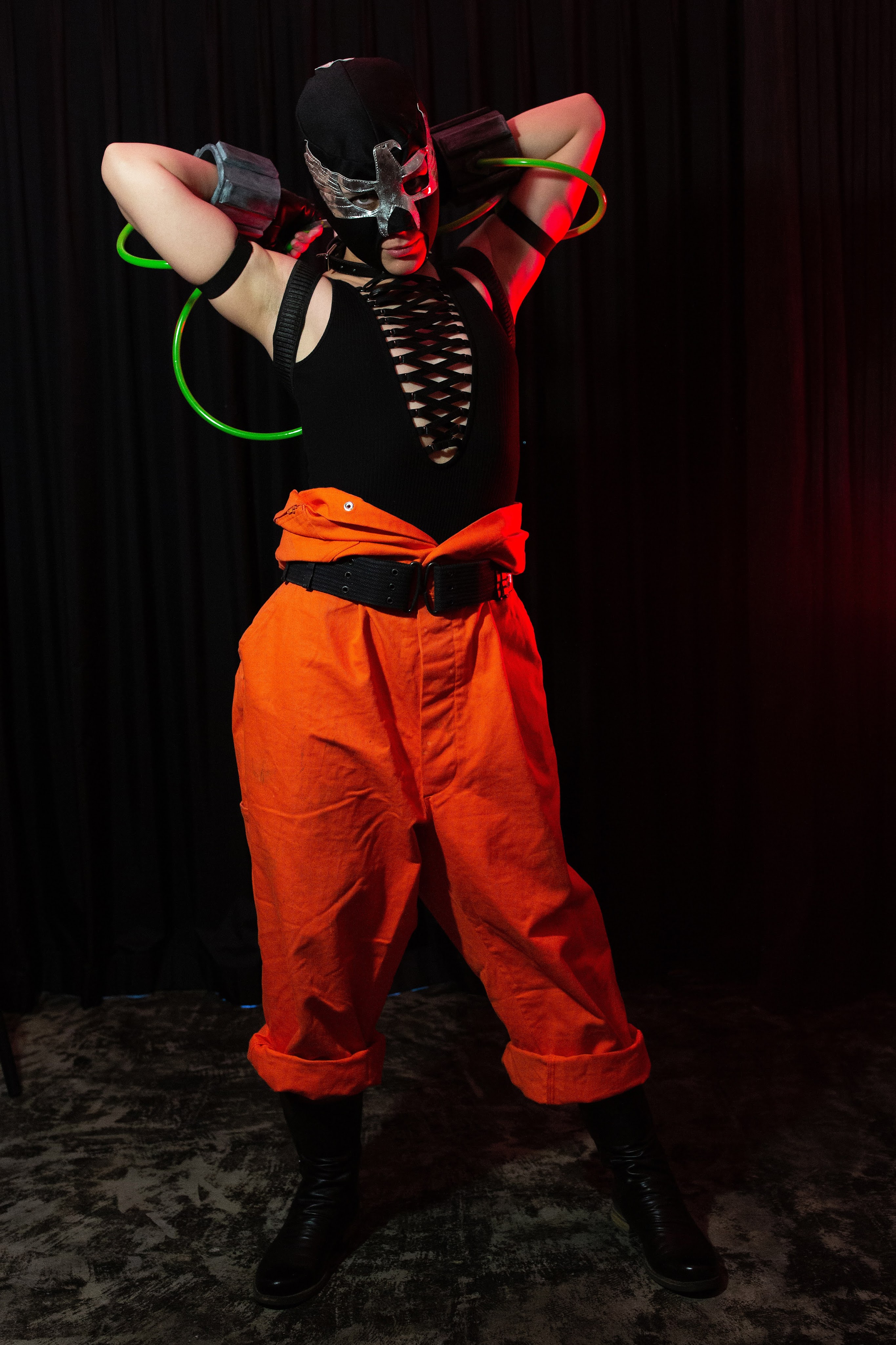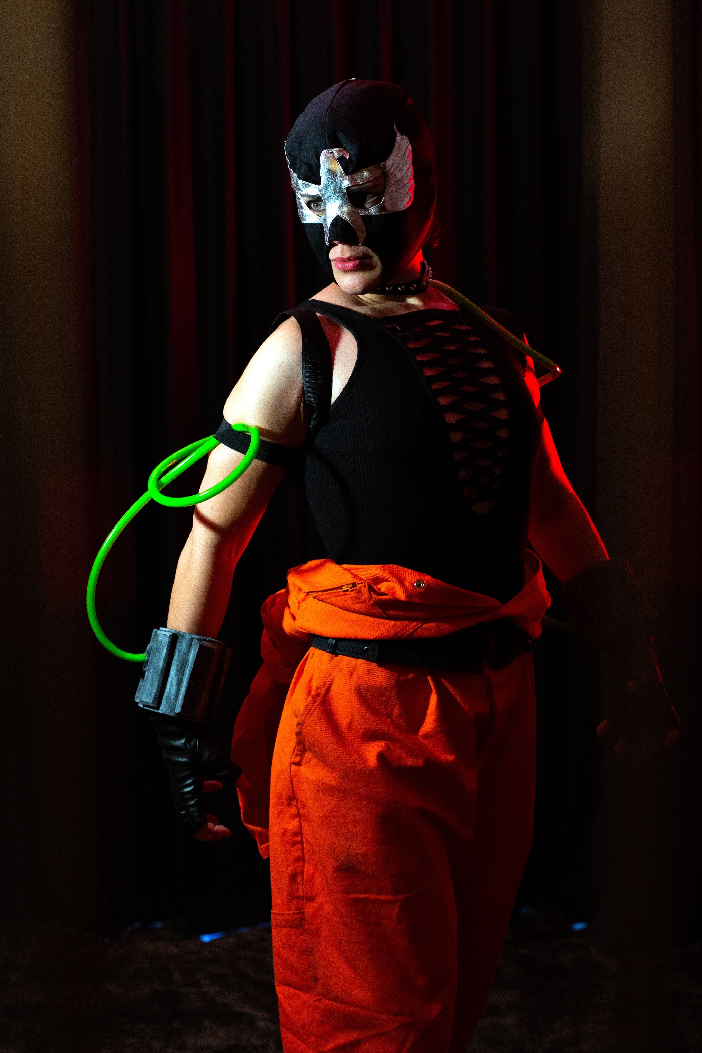The bodysuit was made by me, the gloves and boots I already had. The mask was a fun challenge. It was made from leather that I engraved myself. The head mounted goggles were constructed from Lego pieces with the assistance of my father. It’s the one time he ever worked on a costume with me.