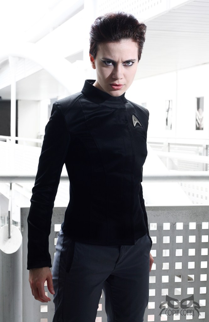 My auburn hair has kind of become a signature part of my look throughout these shoots, but every once in awhile I find it’s not approriate for a certain character, Khan being one of them. I used a temporary rinse, the auburn still kind of shows through, but it’s darker at least.
