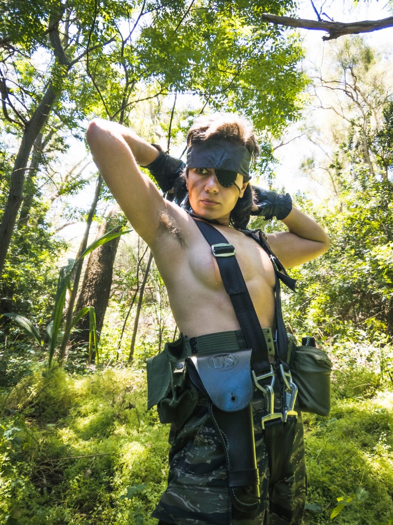 Here’s another solo shoot, just me and my phone camera. This is around the same spot that I did my first Naked Snake photoshoot, although they have since destroyed that beautiful little alcove of trees I had used. Still the area provided the kind of scenery I needed, with bonus authentic mosquitoes. I was being eaten alive, it was worth it. It’s nice to see how far my costume and my physique have come in about a year. That STABO harness was a nightmare from beginning to end. It’s been my white whale for years, I finally found authentic parachute clips online, but they only shipped to the United States, so I needed my dad to order them and ship them to me. I thought sewing the straps would take an hour tops, instead it took nine hours. It’s a complicated system to begin with, but then in the game, there’s no adjustment straps, so I had to tailor to fit me exactly. Then on top of that I had to figure out a bunch of hidden tricks to make it conform better to my body.